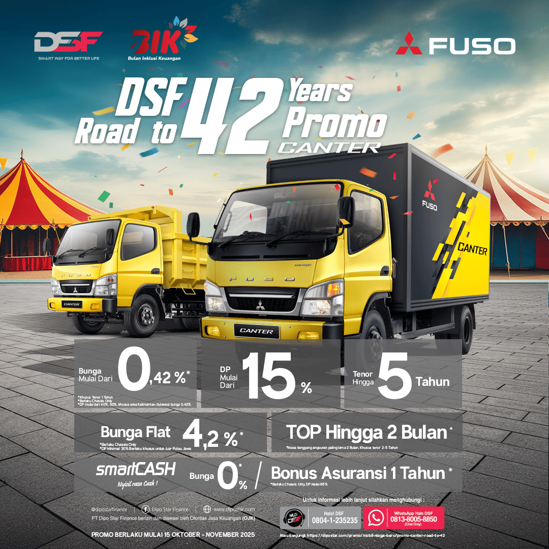 Menyambut ulang tahun ke 42, DSF menyediakan berbagai promo menarik untuk Canter. Manfaatkan promonya dan dapatkan Canter dengan promo cicilan menarik!