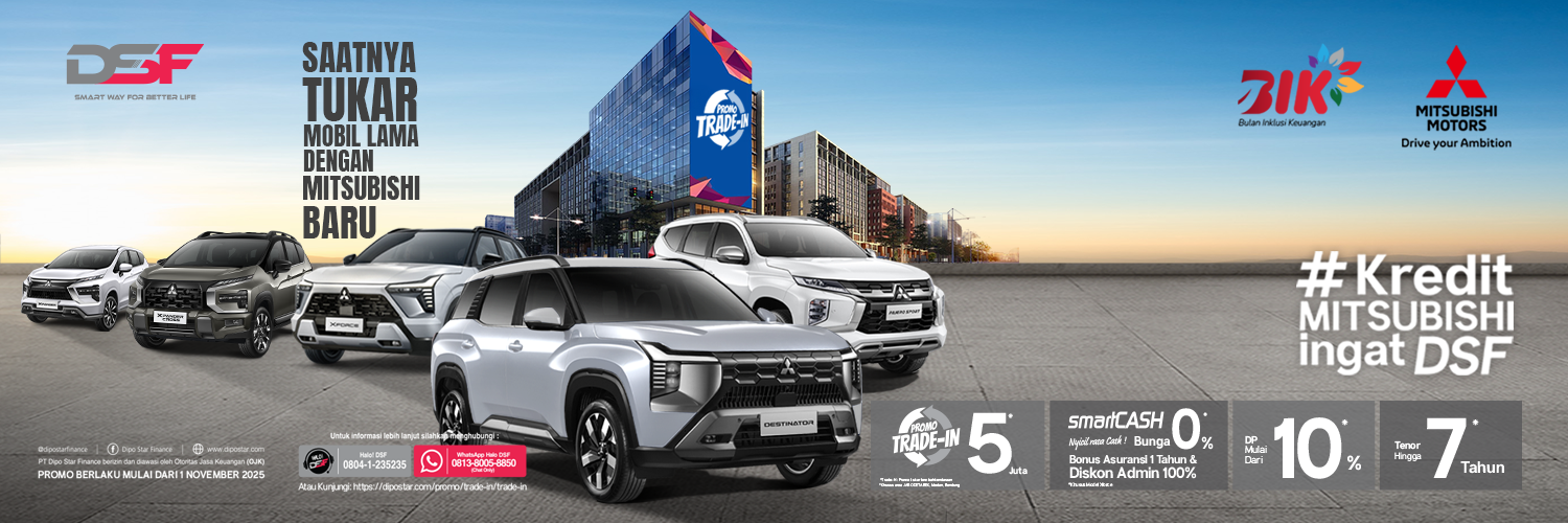 Program trade-in (tukar tambah) ini khusus untuk konsumen yang ingin tukar mobil Mitsubishi lama ke unit Mitsubishi baru melalui pembiayaan Dipo Star Finance. Nikmati promo trade-in berupa Cashback hingga 5 juta dan program pembiayaan Smartcash, dengan bunga 0%, bonus asuransi All Risk 1 Tahun, dan diskon biaya admin 100%.