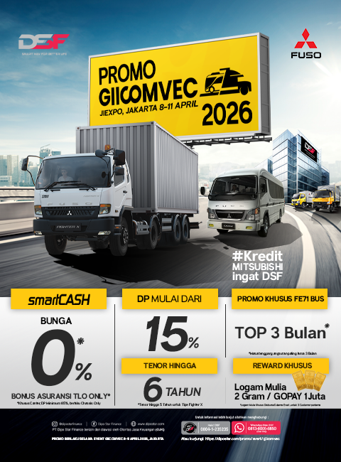 Dipo Star Finance (DSF) hadir di pameran kendaraan komersialGaikindo Indonesia International Commercial Vehicle Expo (GIICOMVEC) di JIEXPO pada tanggal 8-11 April 2026 mendukung penjualan Mitsubishi di Indonesia dengan berbagai penawaran pembiayaan menarik seperti :